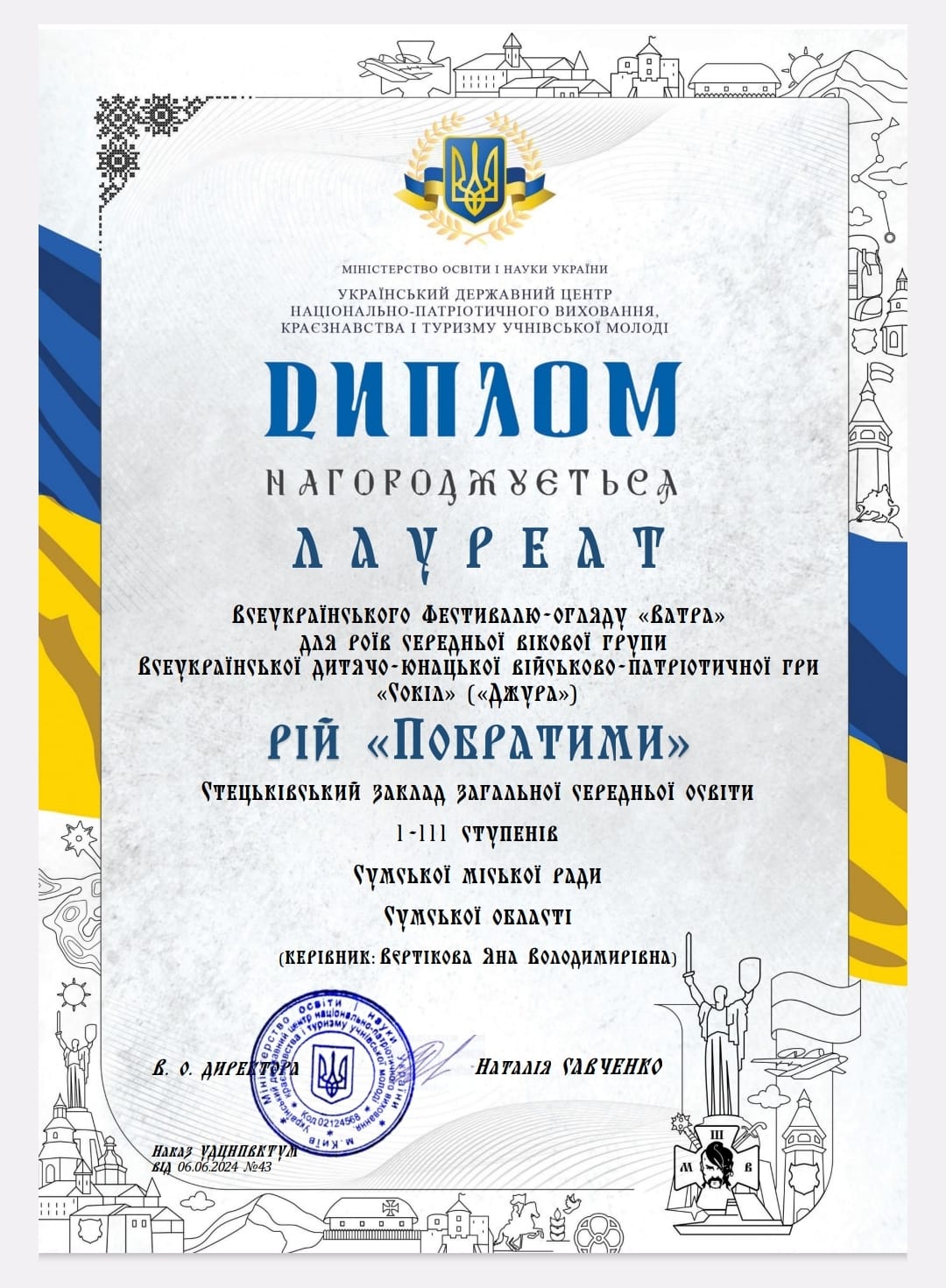 Рій “Побратими” Стецьківського ЗЗСО І-ІІІ ступенів нагороджений Дипломом лауреата Всеукраїнського фестивалю -огляду “Ватра” для роїв середньої вікової групи Всеукраїнської дитячо-юнацької військово-патріотичної гри “Сокіл” (“Джура”)