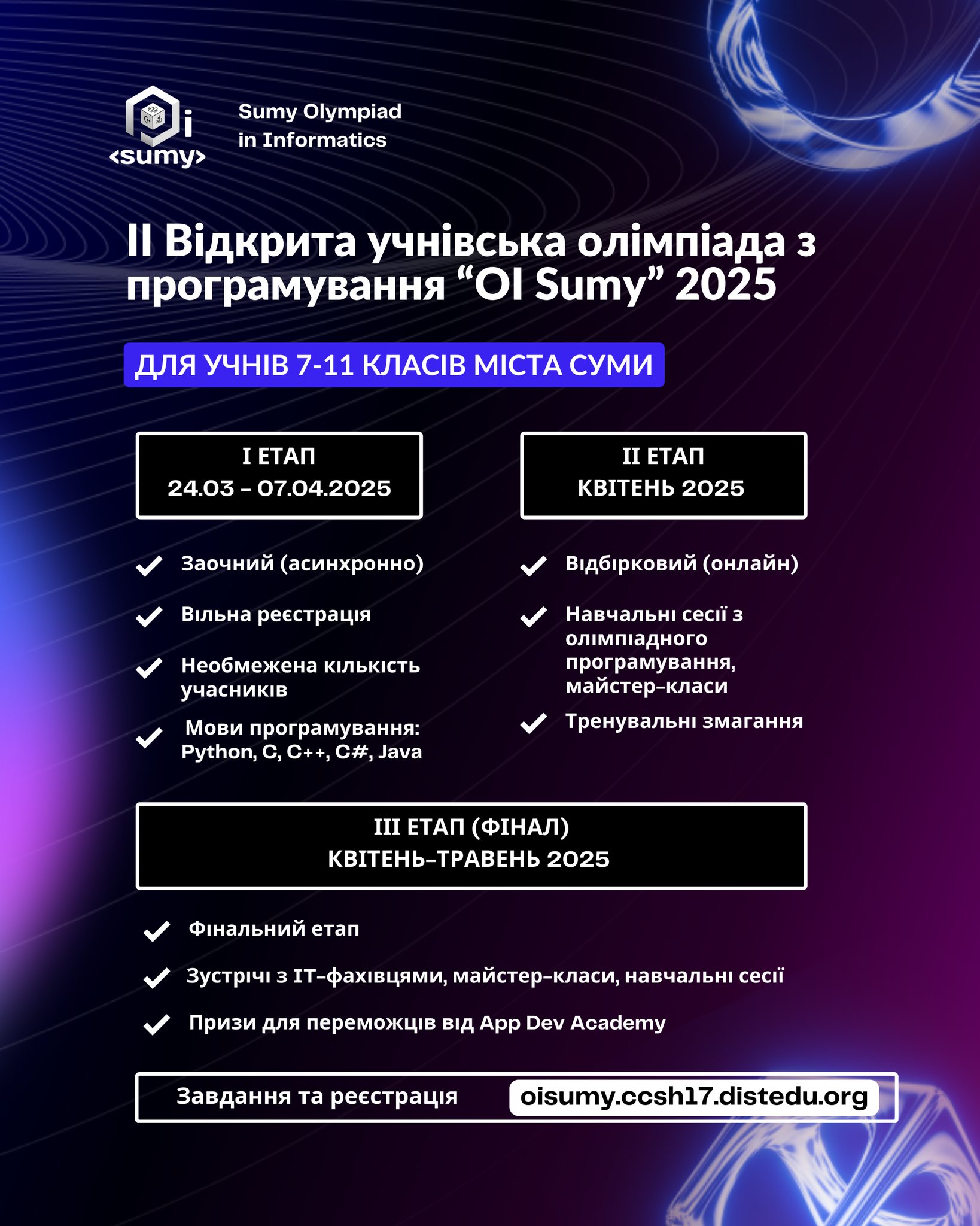 OI Sumy – це відкрите індивідуальне змагання з програмування для учнів 7-11 класів закладів загальної середньої освіти міста Суми. У межах проєкту проводяться навчальні заходи та зустрічі для учнів, які дозволять їм дізнатися значно більше про сучасні засоби, методи та технології програмування.